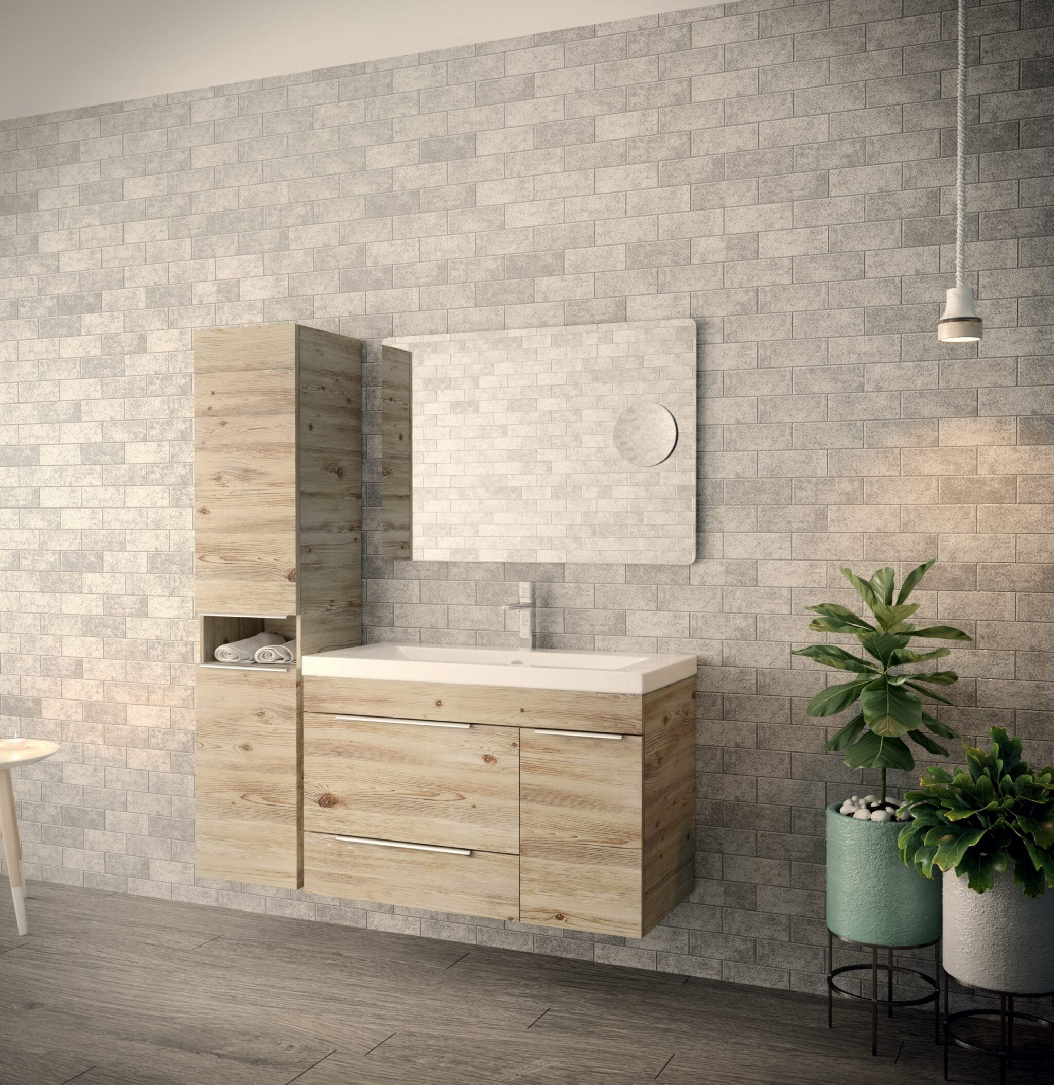 ΥΛΙΚΟ: Μελαμίνη ΧΡΩΜΑ:Νο 19 Καθρέπτης με μεγεθυντικό φακό. Νιπτήρας πορσελάνη Ανάκληση – συρτάρι, ντουλάπι. Στήλη κάτω άπλυτα – πάνω ράφια.