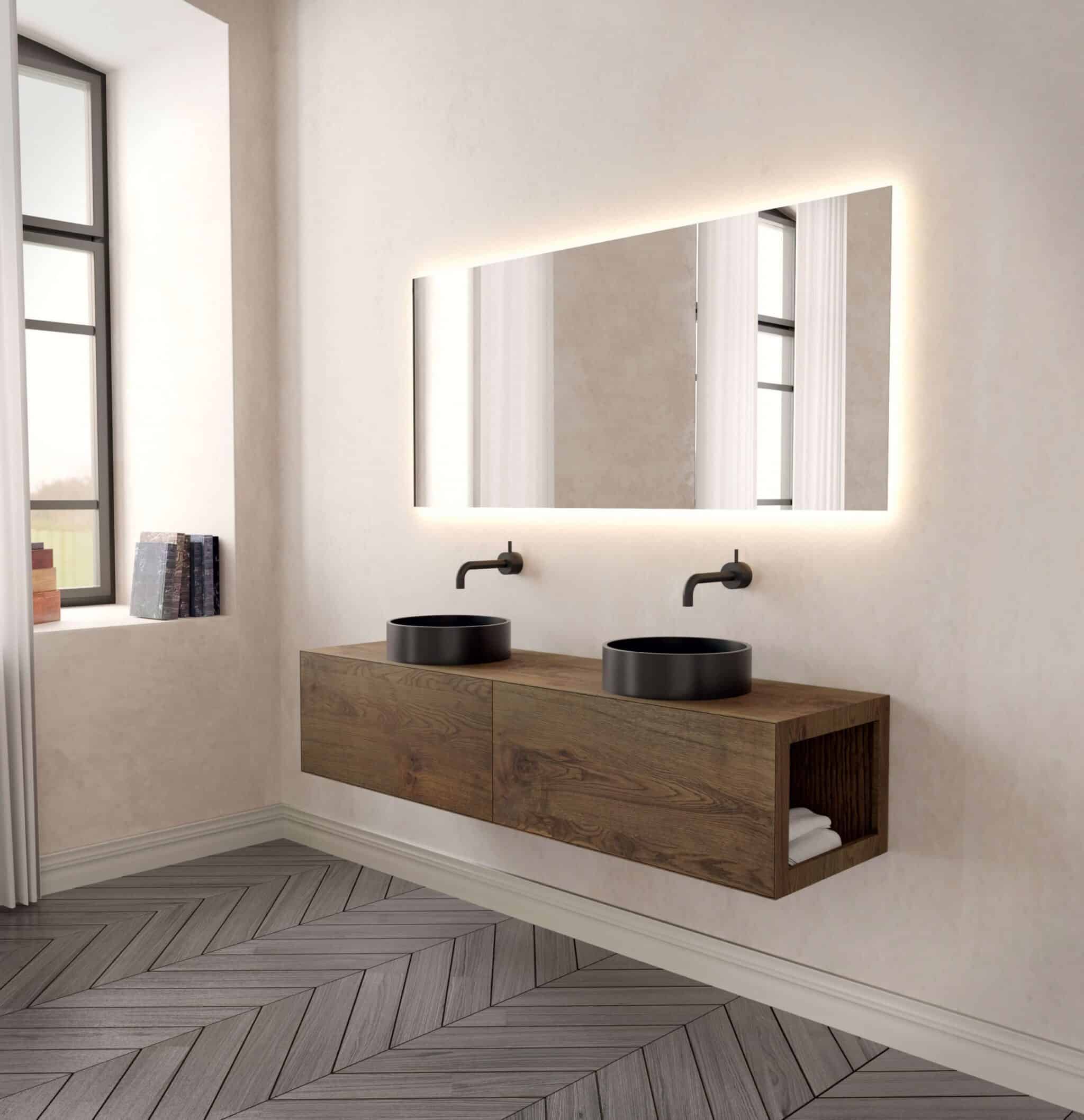 ΥΛΙΚΟ: Κ/Π θαλάσσσης, Δρυς ρουστίκ ΧΡΩΜΑ: Λουστραριστό χρώμα Ν 47 2 συρτάρια, μηχανισμοί push Καθρέπτης με LED στο πίσω μέρος Νιπτήρες τσιμέντο μαύρο ματ.