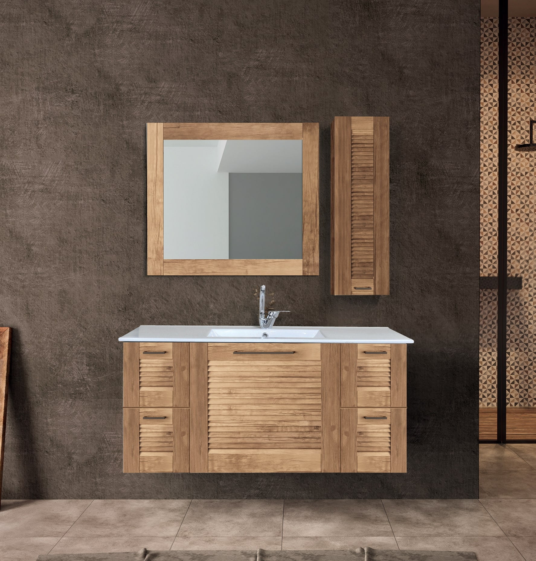 YΛΙΚΟ ΕΠΙΠΛΟΥ: Κ/Π Θαλάσσης ΧΡΩΜΑ: Νο 8 Κρεμαστό 5 συρτάρια- πόρτες γρύλλια Μηχανισμός με φρένο Καθρέπτης ξύλινη κορνίζα Νιπτήρας πορσελάνη